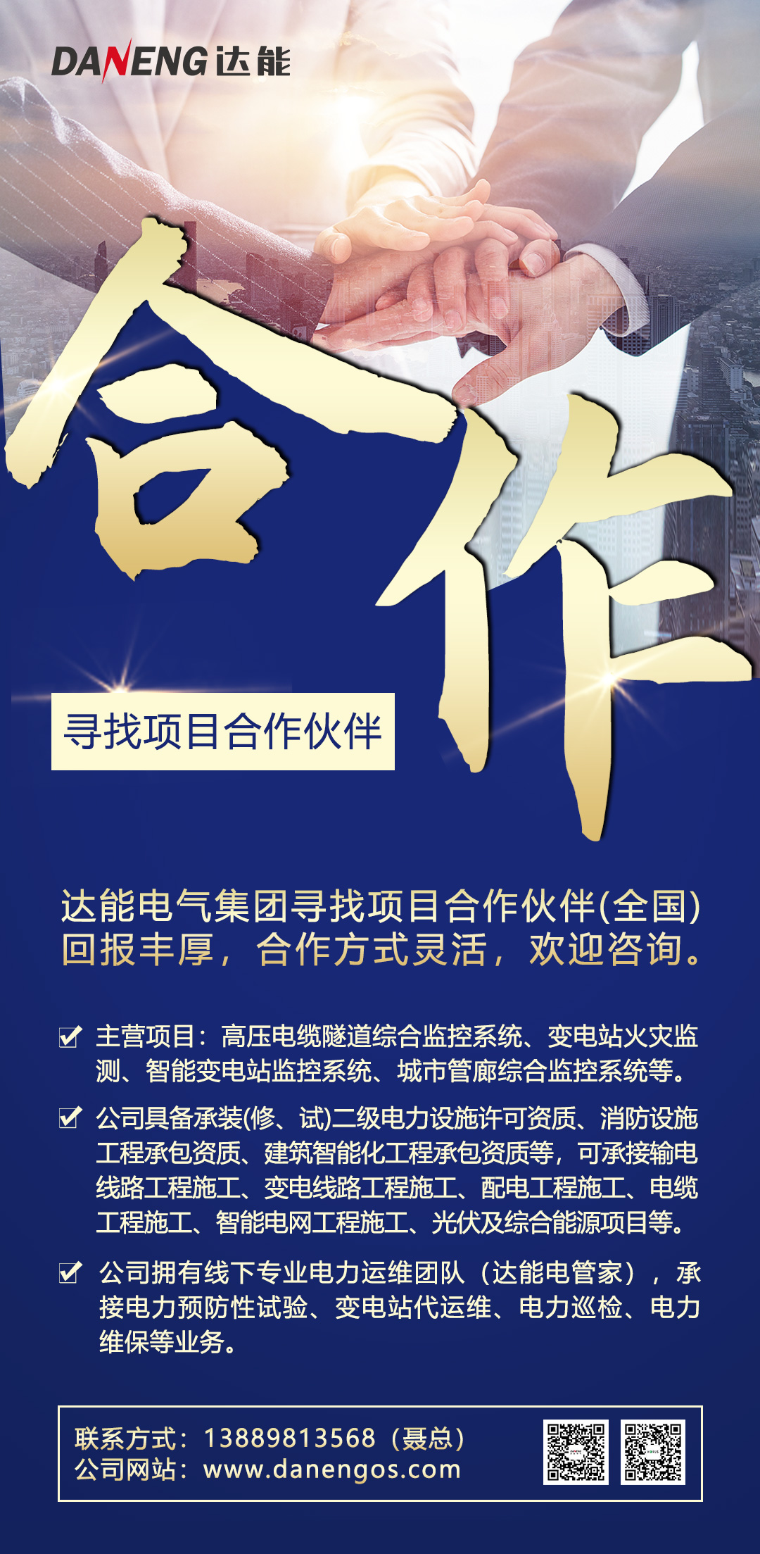 因业务发展需要,mksport体育电气集团全国范围内寻找项目合作伙伴,合作方式灵活,回报丰厚。公司主营项目包括:高压电缆隧道综合监控系统、变电站火灾监测、智能变电站监控系统、城市管廊综合监控系统等。