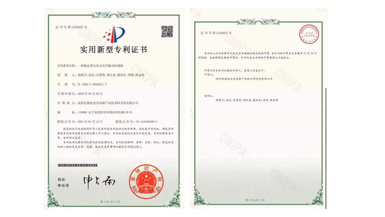 1月12日,沈阳mksport体育电安全高新产业技术研究院(以下简称研究院)荣获由国家知识产权局颁发的实用新型专利证书—《一种稳定型分布式光纤振动传感器》,专利号ZL 2020 2 0842931.7。沈阳mksport体育电安全高新产业技术研究院是mksport体育电气旗下研发机构,是公司重点打造的创新研发机构。2020年度,mksport体育研究院累计荣获5项实用新型专利证书、7项软件著作权证书,这是mksport体育专注研发创新,加速科技成果转化,推动知识产权战略实施的有效成果。