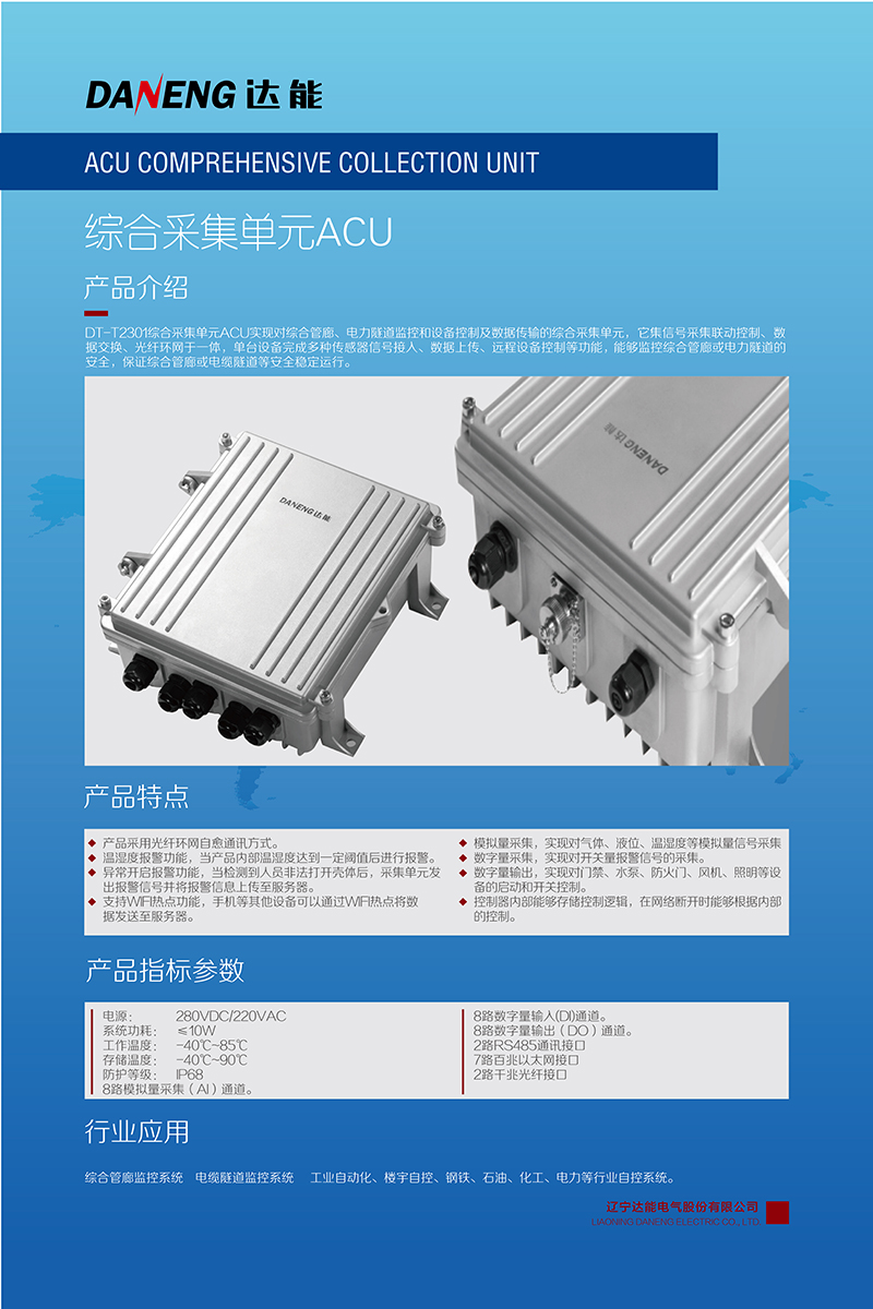 城市综合管廊或电力隧道的安全稳定运行,离不开综合监控系统,而数据采集单元是监控系统的重要组成部分。mksport体育电气自主研发生产的DT-T2301综合采集单元ACU实现对综合管廊、电力隧道监控和设备控制及数据传输的综合采集单元,它集信号采集、联动控制、数据交换、光纤环网于一体,单台设备完成多种传感器信号接入、数据上传、远程设备控制等功能,能够监控综合管廊或电力隧道的安全,保证综合管廊或电缆隧道等安全稳定运行。