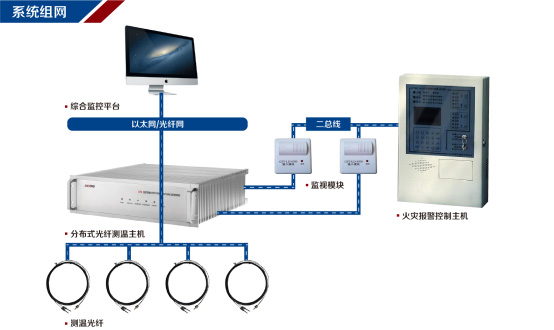 系统描述:分布式光纤测温仪(DT-412C)是一种光时域温度监测系统,是国内外应用较成熟的分布式光纤测温系统,该系统由测温主机(DT-412C)、感温传感光纤、DTS后台分析软件三部分组成。它以光线中的拉曼散射原理为技术基础,综合光时域反射技术(OTDR)和(Raman)散射光对温度敏感的特性,探测处沿着光纤不同位置的温度的变化,通过DTS后台软件数据的智能分析,实现真正分布式的测量,可连续测量光纤沿线任一点所处的温度。其测量距离从几公里到几十公里的范围,空间定位精度可达到1m量级,且能进行不间断实时在线监测并将实时数据远传,可及时预警火灾隐患,并精确定位火灾发生的位置。可实现大范围空间温度分布式实时测量,具有测量距离长、无测量盲区、实时监测、可精确定位等优点,在交通隧道、隧道、地铁、电力、石化、水利等领域均有广泛应用。